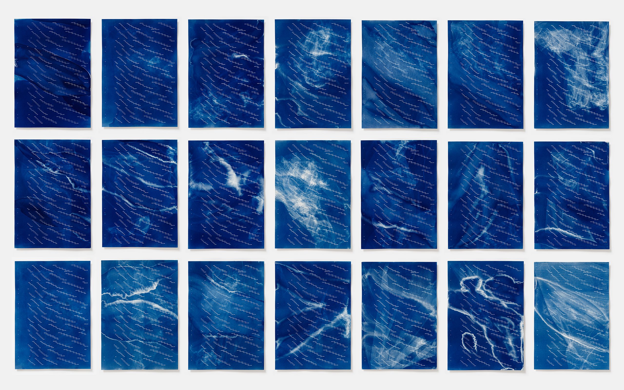 Impresso em cianotipia, o cartaz é, ele próprio, um produto da exposição ao tempo. O azul profundo da técnica fotossensível faz emergir uma leitura do ano que a precisão dos números não alcança: dias que se expandem ou encolhem, o balanço das semanas, letras e tons de azul que se repetem mais que outros. Mais do que marcar o tempo, o calendário é um convite a percorrê-lo.