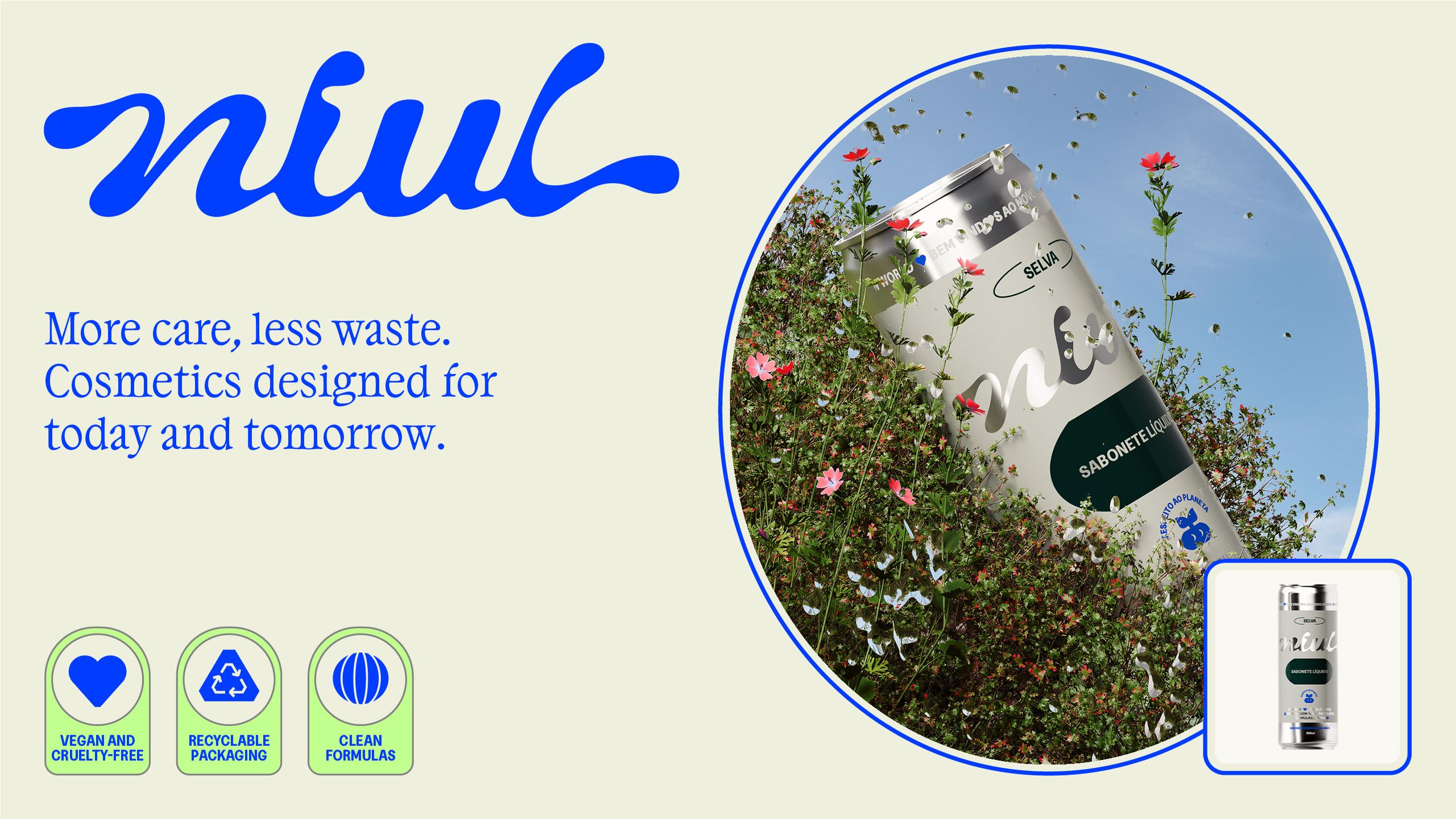 Niul é a primeira marca de cosméticos no Brasil a adotar latas de alumínio como embalagem. A decisão nasce de um dado simples e impactante: enquanto quase 100% do alumínio é reciclado no país, apenas 1,3% do plástico tem o mesmo destino. A proposta é direta — fórmulas limpas, veganas e cruelty-free em embalagens infinitamente recicláveis, que voltam a ser embalagem, fechando o ciclo.