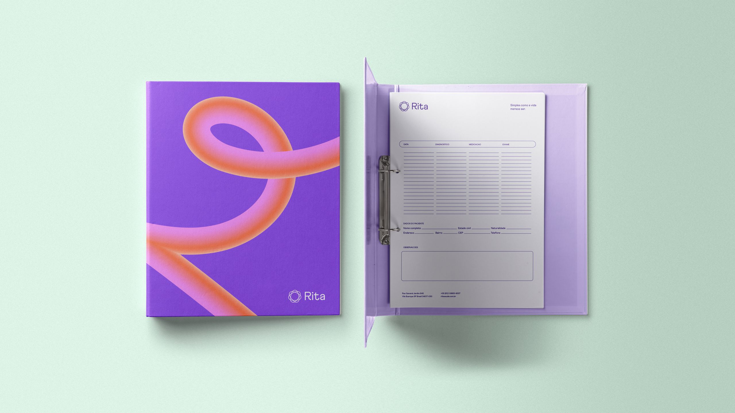 As one of the first digital native companies in the segment, the chromatic palette is designed for use on screens, but relies on calming and comforting colors. The symbol, designed to represent this link between people and health services that Rita seeks to be, is a shape without beginning or end, and reflects the light, organic and constant way that the company sees health care for subscribers.
